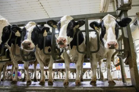 Shareable photo: Holstein dairy cattle in milking parlor.