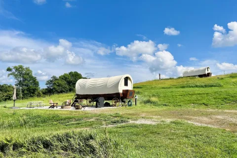 Come enjoy a one-of-a-kind glamping experience in a luxury covered wagon in the beautiful Loess Hills of Iowa. Best Nest Farm offers the best of all worlds: a lake teeming with fish and wildlife, pristine woodlands, pasture and farmland. Leave your tent at home and enjoy a fully-outfitted modern covered wagon complete with a full bathroom, which includes a sink, flush toilet and hot shower, outlets with USB ports, AC/heat, mini fridge, microwave, Keurig, private firepit and propane Weber grill. Explore our 50-acre property on well-maintained walking trails.