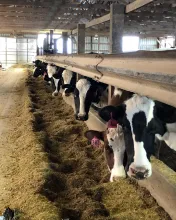 All of our young stock and dry cows are on large pastures. The milking cows are housed in a free stall barn that is bedded with deep sand, which is very comfortable for them. They also have sprinklers and fans to keep them cool during the summer months, and large curtains we can pull up on days when it's cold and windy.
